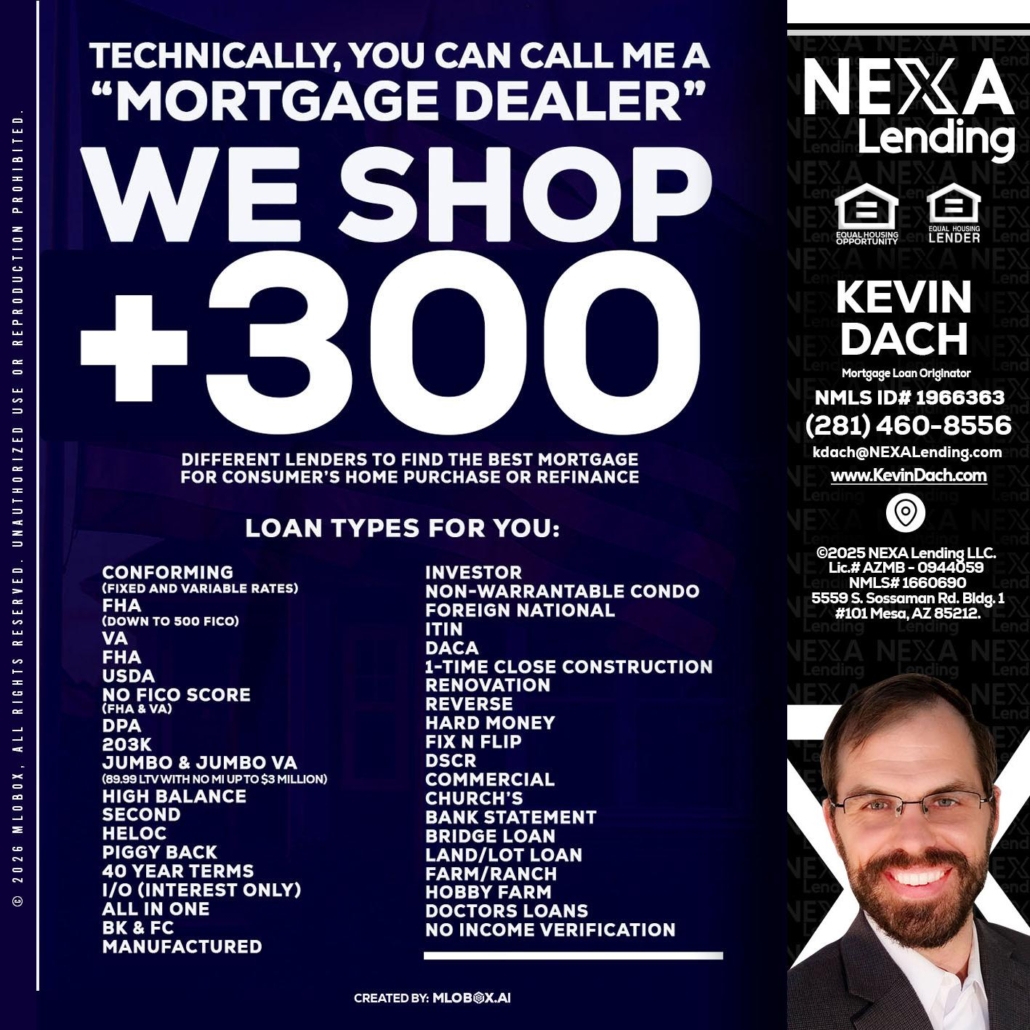 Hi, my name is Kevin Dach. I’m a Loan Officer with NEXA Lending LLC., offering personalized mortgage solutions, fast customized quotes, great rates and service with integrity.