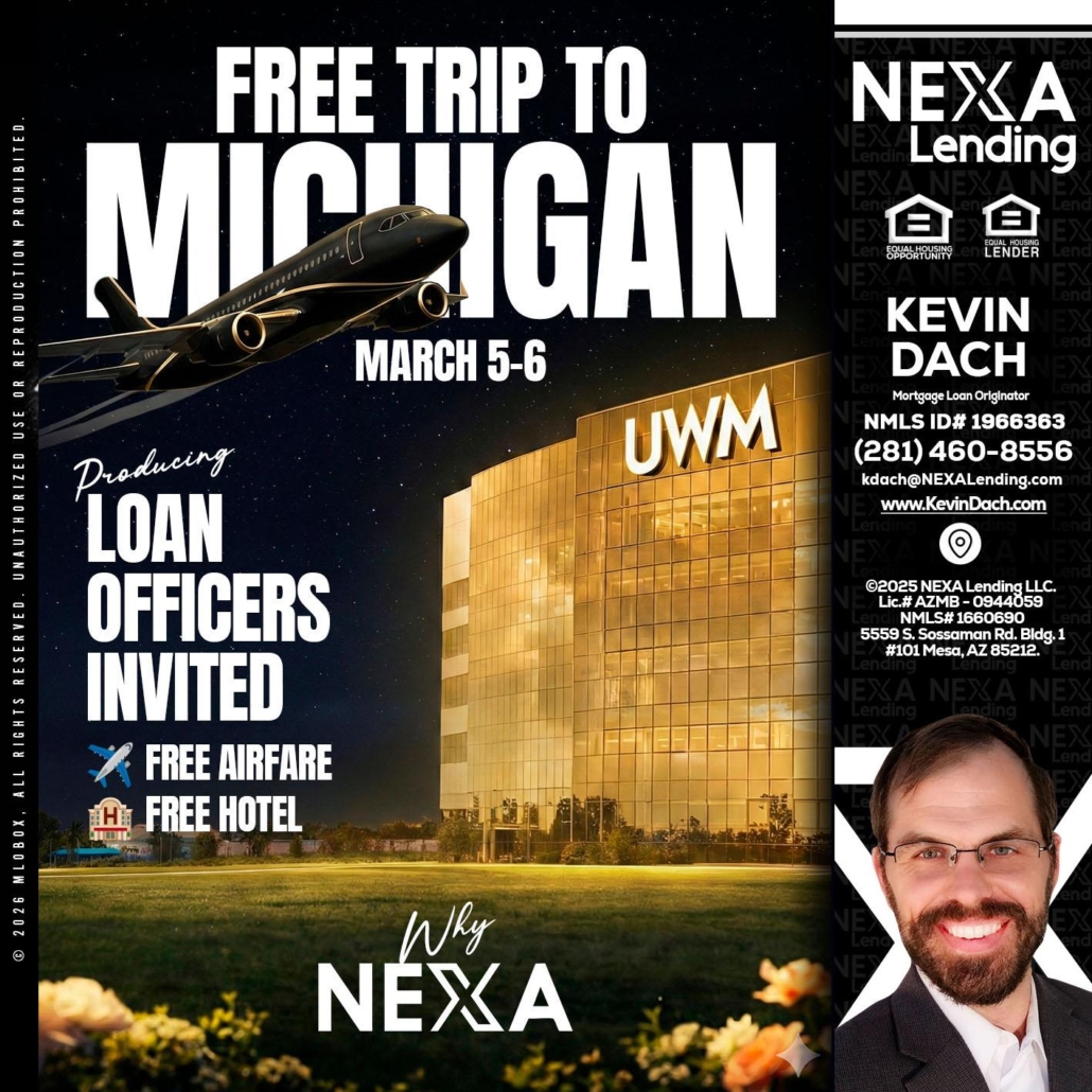 free Michigan trip - Kevin Dach -Loan OfficerHi, my name is Kevin Dach. I’m a Loan Officer with NEXA Lending LLC., offering personalized mortgage solutions, fast customized quotes, great rates and service with integrity.